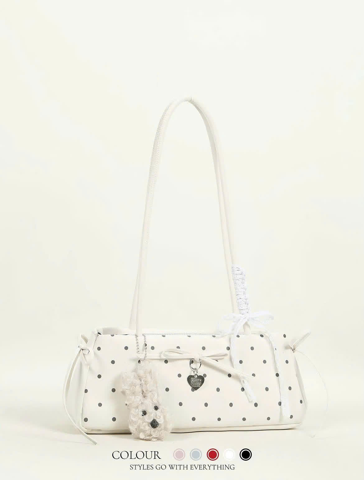 Túi đeo vai họa tiết chấm bi nhẹ nhàng, điểm nhấn nơ và charm đáng yêu. Phù hợp cho phong cách nữ tính, đi chơi hoặc hẹn hò.phối đồ, phù hợp sử dụng hằng ngày với phong cách nhẹ nhàng, hiện đại.